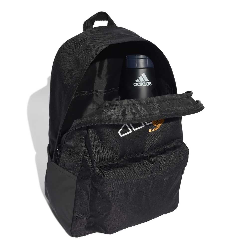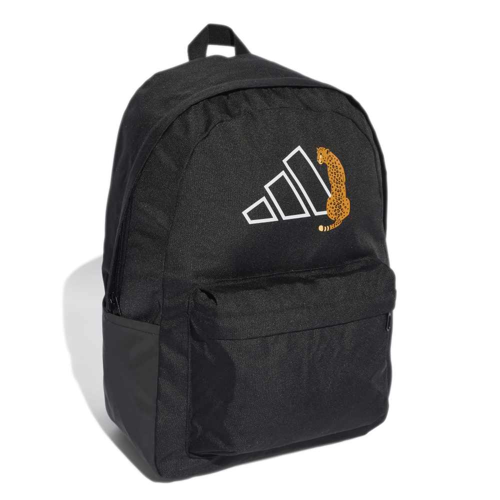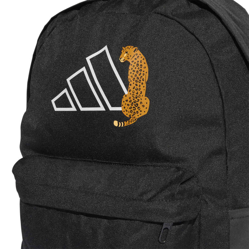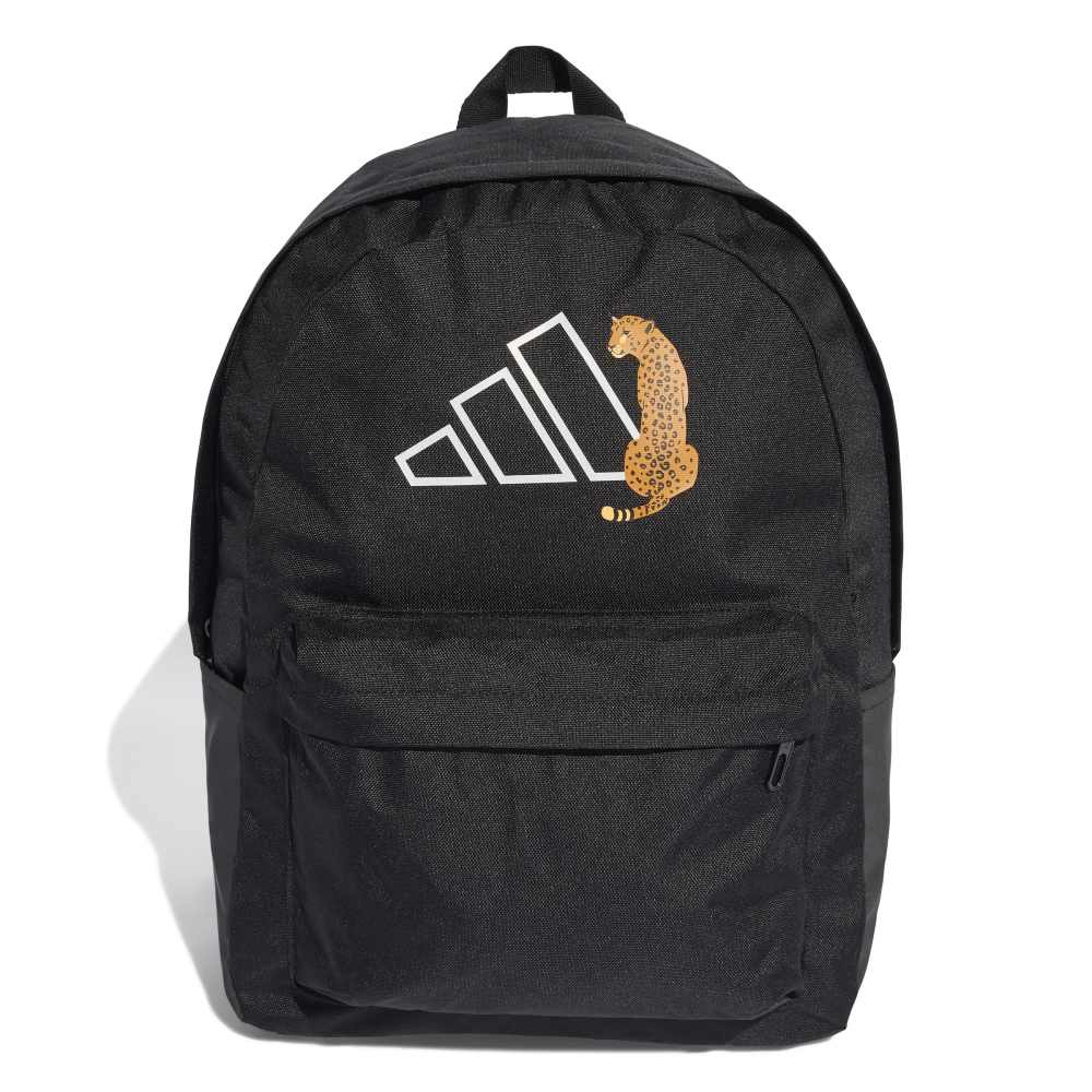 - Unleash your wild side with the adidas Classics Leopard Graphic Backpack, designed for adults and suitable for any occasion. This eye-catching backpack, adorned with the iconic adidas 3-bar logo, is crafted from 100% recycled polyester, blending style with versatility. Featuring a padded, adjustable design and secure zipper closure, it ensures comfort and practicality whether you're heading to the gym or exploring the urban jungle.