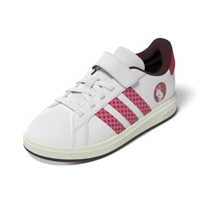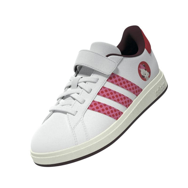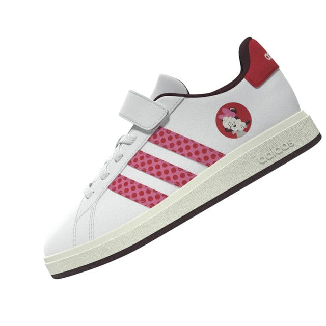 - Introducing The Adidas Disney Minnie Grand Court 2.0 Shoes, Designed For Children Who Love To Play And Make A Statement. These Unisex Shoes Are A Reinvention Of Adidas' Most Iconic Sportswear Court Model, Now With The Softest Sole Ever For Infant Comfort. The Upper Is Composed Of Textile And Synthetics, Providing Durability While The Rubber Outsole Ensures Grip During Playtime. The Shoes Feature An Easy-To-Use Elastic Lace And Hook-And-Loop Closure System. With Minnie Mouse Printed On The Sidewall And Polka Dots Adorning The 3-Stripes, These Shoes Bring Fun And Style To Any Outfit. Perfect For Street Wear Or Play, They Offer Regular Fit And Are Sure To Be A Hit With Any Disney Fan.