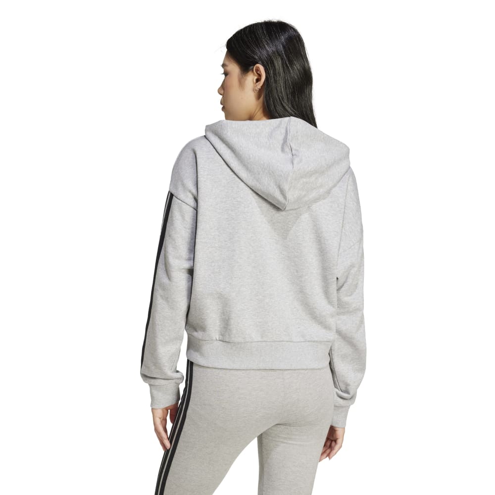 - Introducing the Essentials 3-Stripes French Terry Full Zip Hoodie for women. This regular fit, hooded track top is made with a blend of Better Cotton, recycled Polyethylene Terephthalate, and Viscose. It's a nod to adidas' commitment to end plastic waste, with a sustainable design that supports sustainable cotton farming. The traditional three stripes branding and modern fit make it a versatile addition to any wardrobe, easily paired with your favourite fashion items.