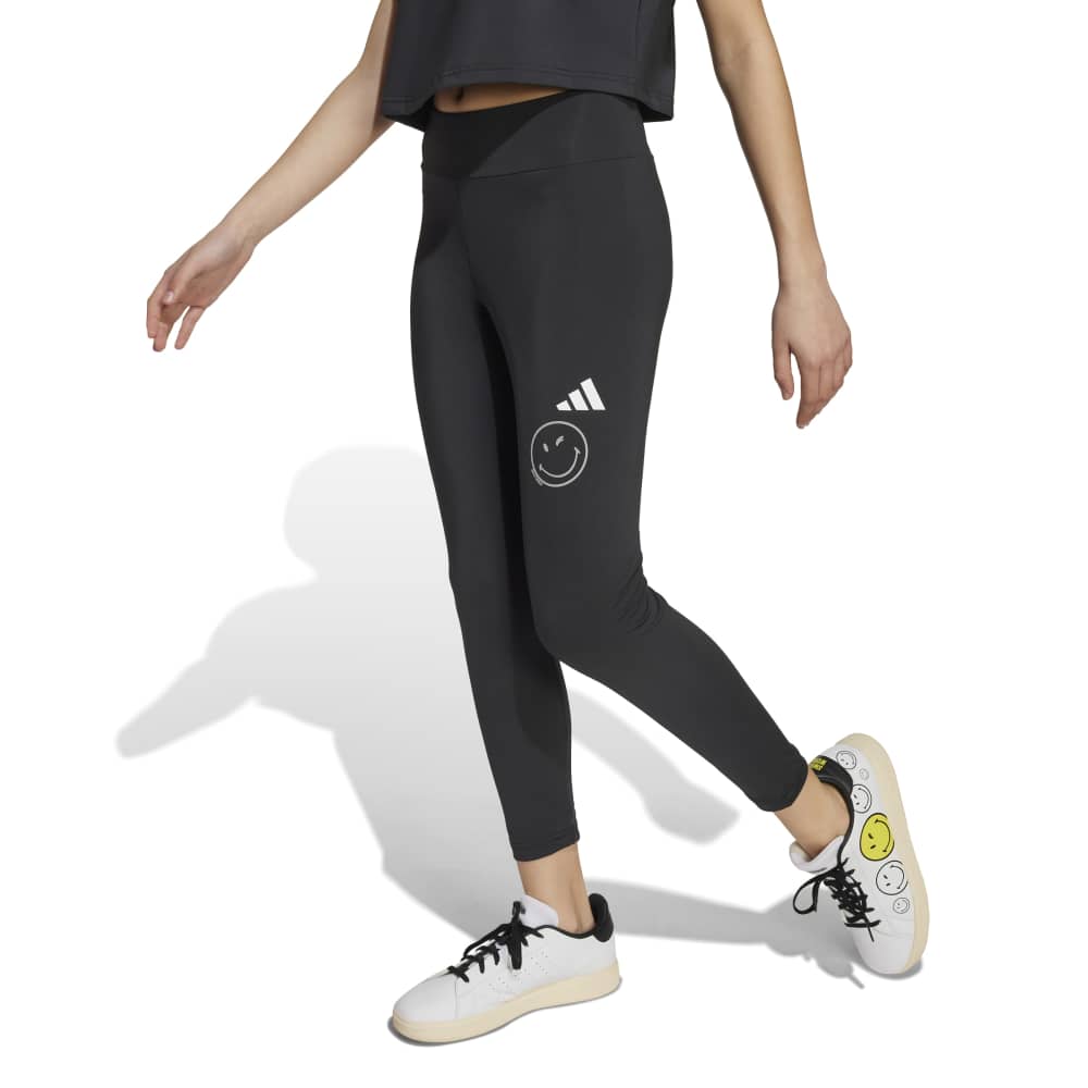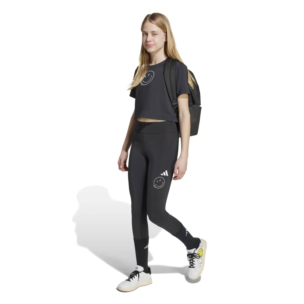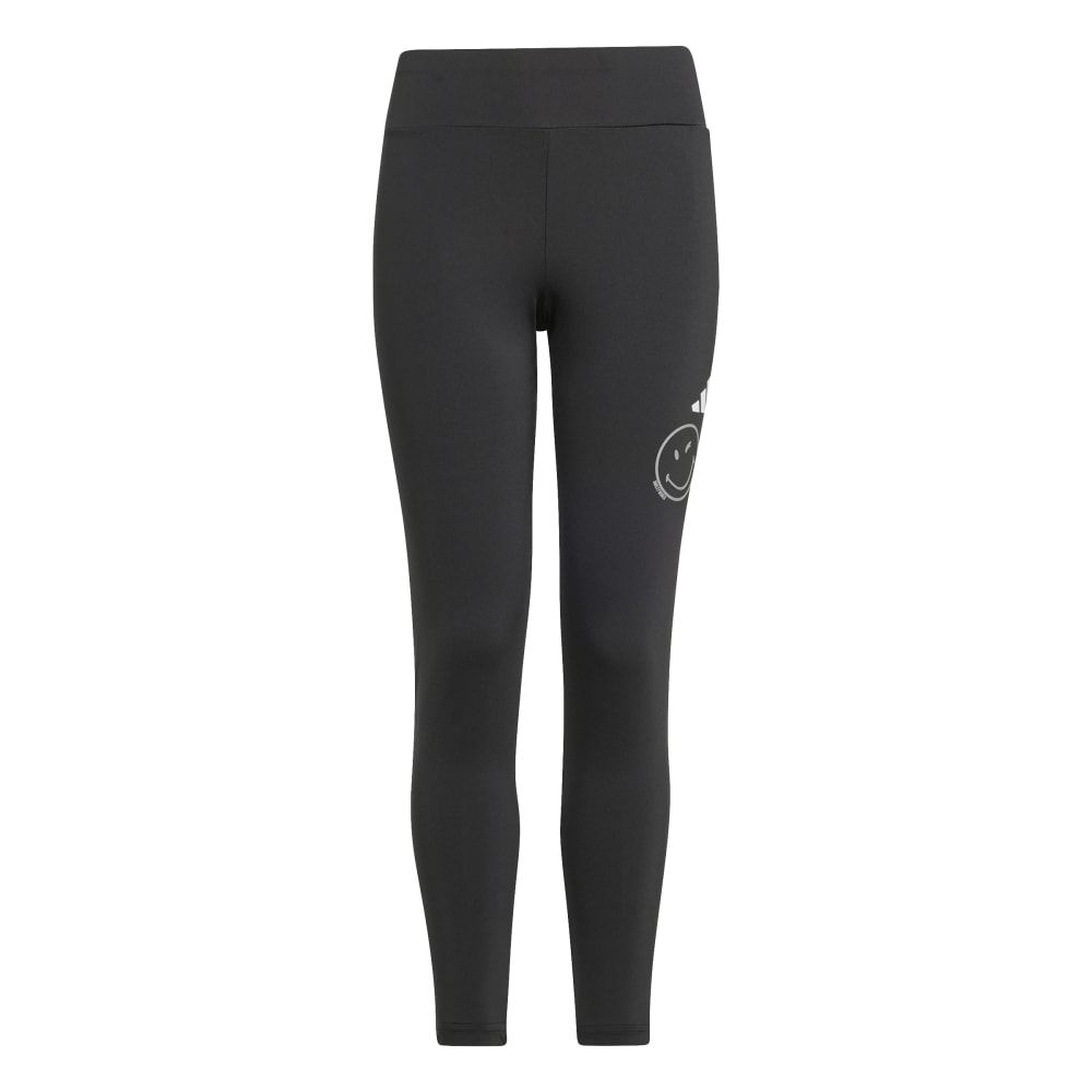 - Bring a burst of joy to your junior's wardrobe with the adidas x SmileyWorld Training Leggings. These tight-fitting sportswear leggings are crafted from 80% recycled polyester and 20% elastane knit, ensuring both comfort and versatility. Featuring a high-rise design and air-permeable materials, they keep your child dry and comfortable throughout the day. The unique SmileyWorld print and reflective details add a playful touch, making these leggings perfect for any activity.