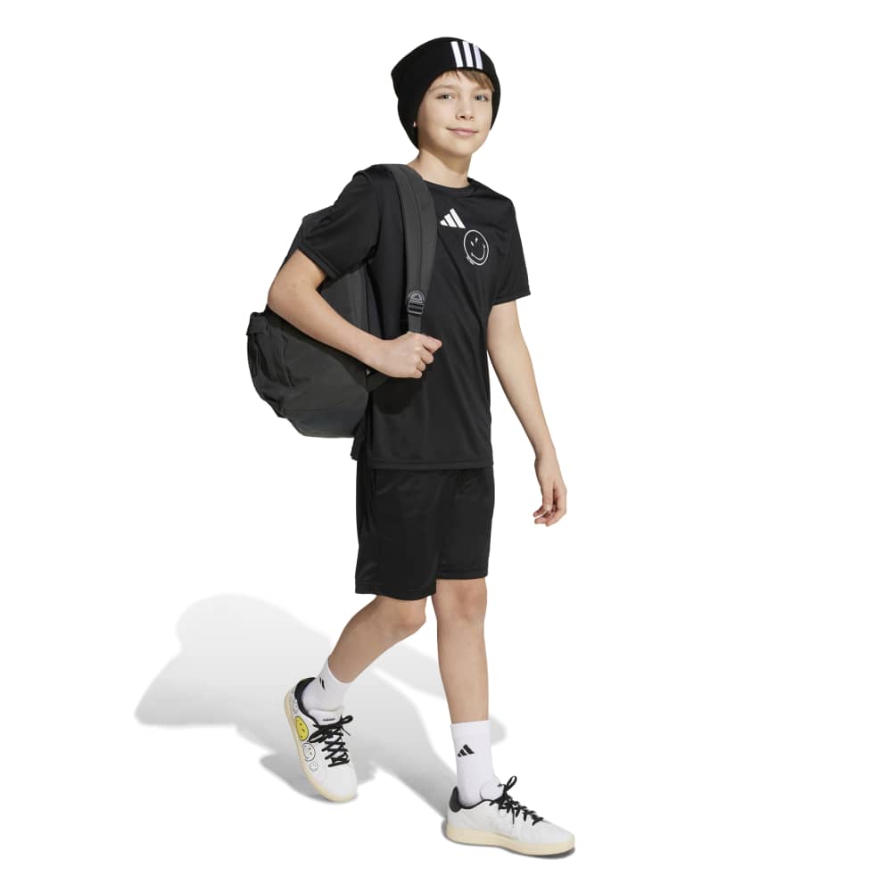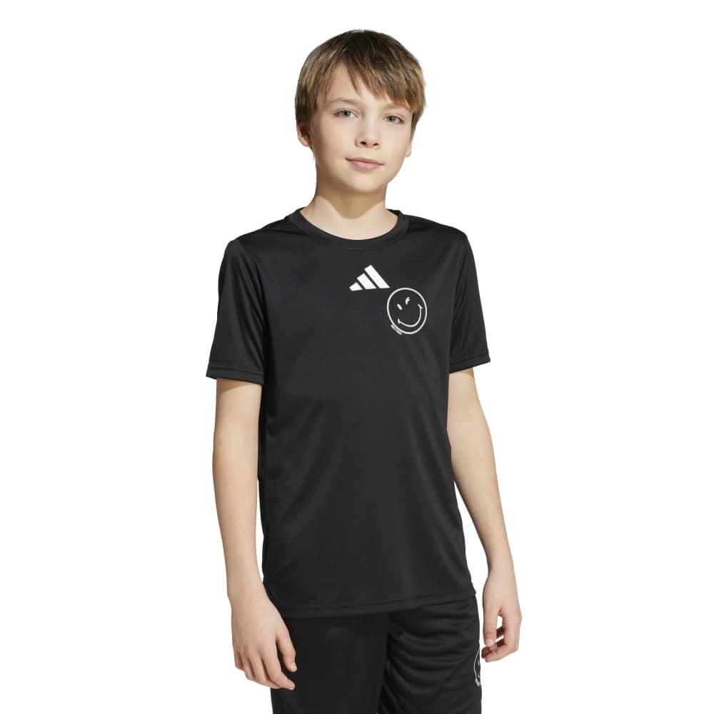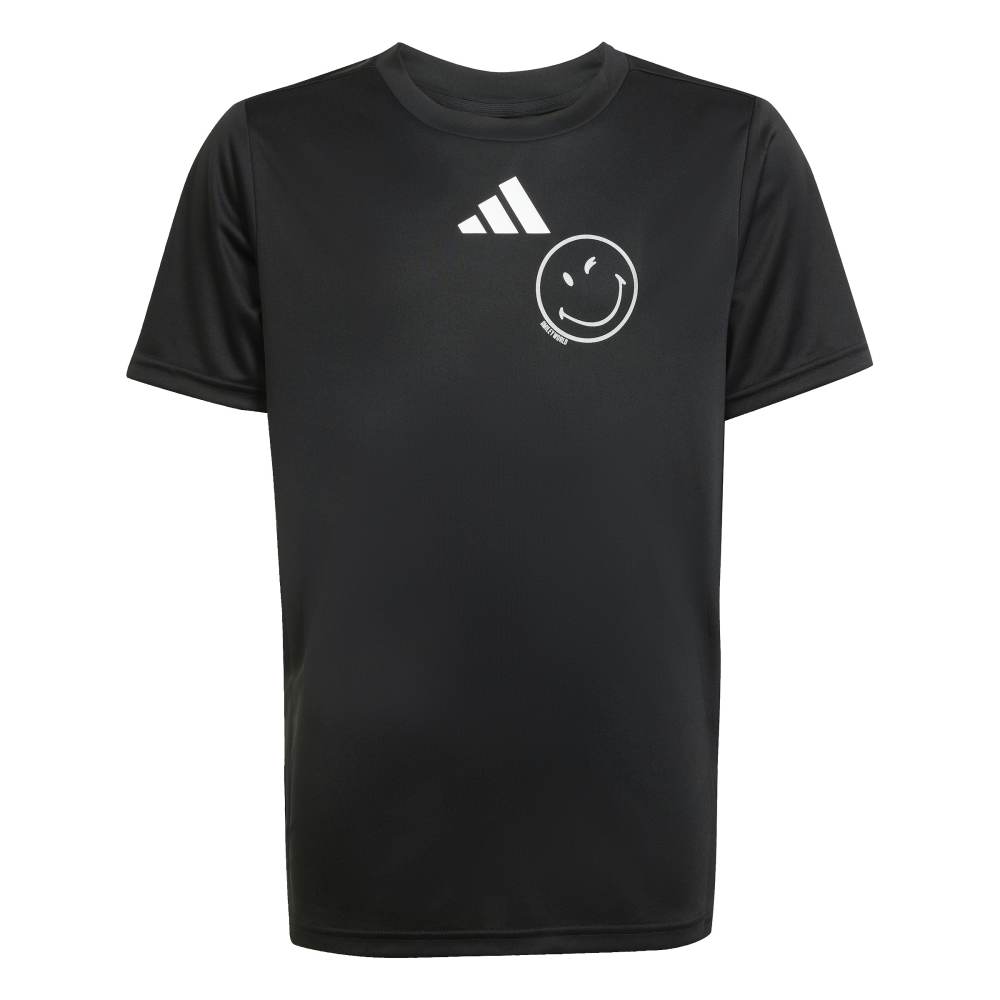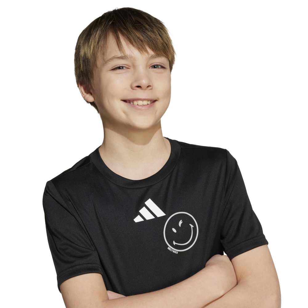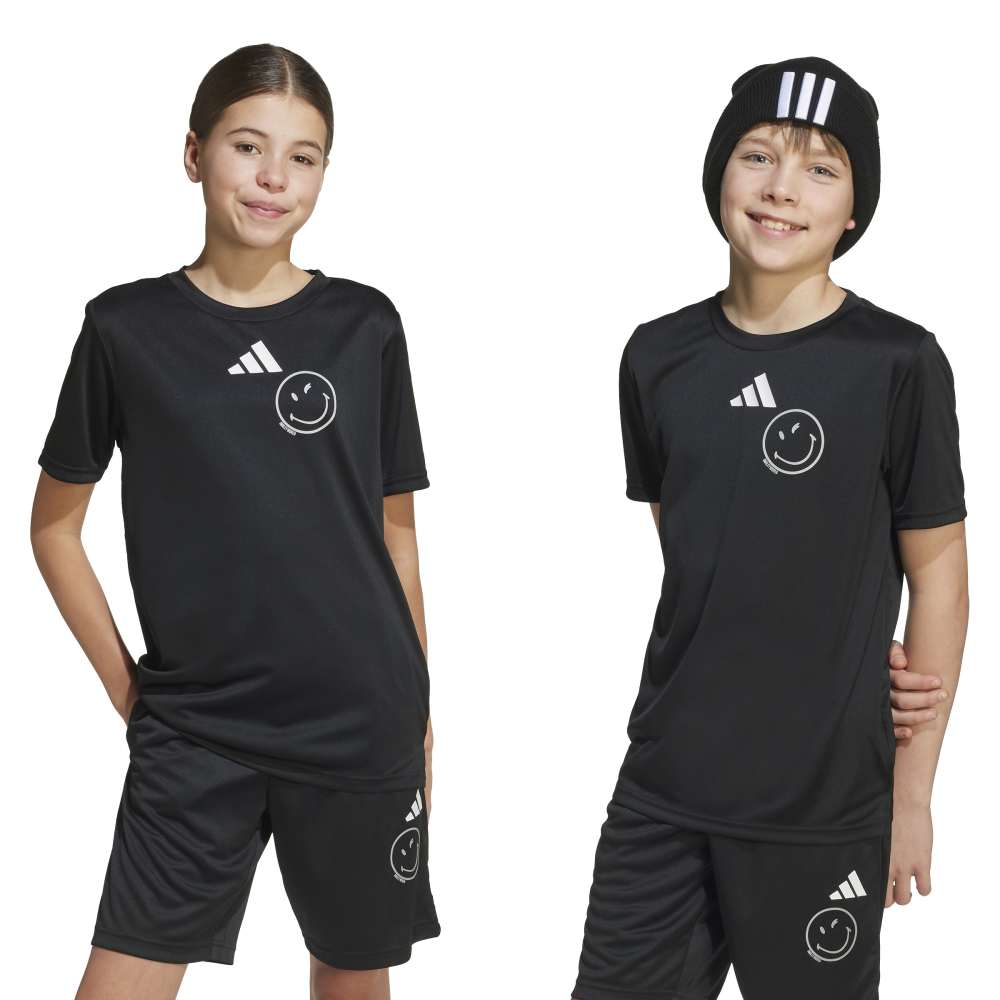 - Brighten up your day with the adidas x Smileyworld Training T-Shirt, designed for juniors. This regular fit, short sleeve tee is featuring a unique and exciting print that celebrates happiness with the iconic Smiley yellow. Crafted from 100% recycled polyester in a knit construction, it includes air permeable materials to keep you dry and comfortable, and reflective print details for enhanced visibility. With the 3 bar logo and Smileyworld signoff, this t-shirt is a joyful blend of fun and function.