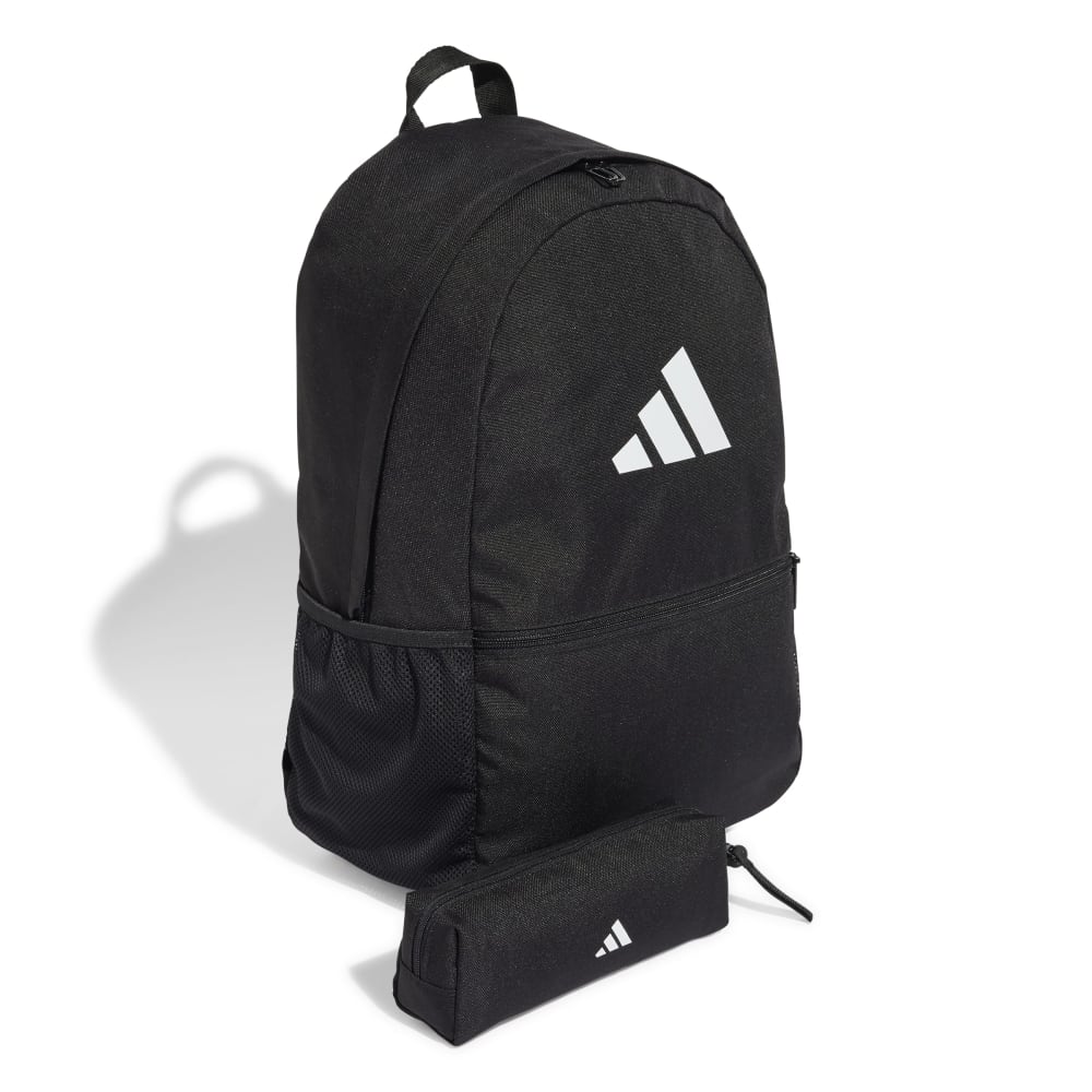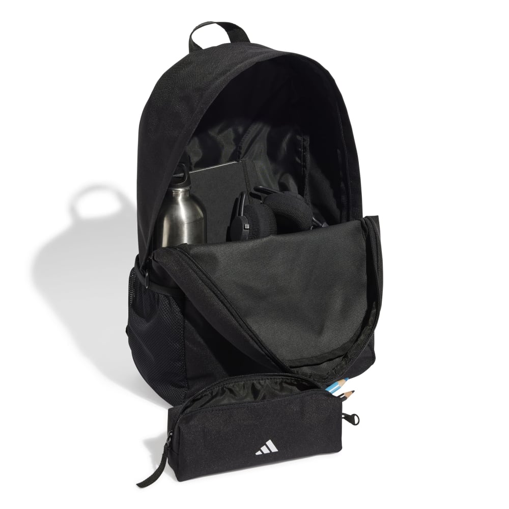 - The adidas Backpack with Pencil Case, designed for all, is a practical addition to your training gear. Crafted with recycled materials, it features a large opening for easy access, a side slip-in pocket for a bottle, and a front zipped pocket for smaller items. The backpack boasts a bold BOS logo print on the front and comes with a handy pencil case. Adjustable shoulder straps ensure a comfortable fit. A sustainable choice, made in part with recycled materials.