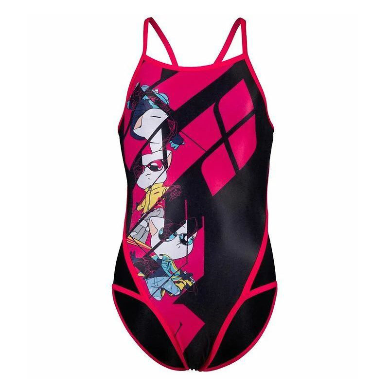 - Beautiful Arena swimsuit in black with red stripes on the front and a large print of three cats in clothing. On the back, the brand's logo is printed in red and all the edges are red.