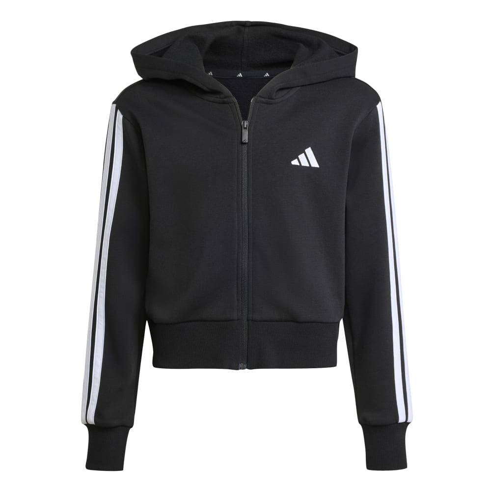 - Introducing the Essentials Tracksuit for juniors, designed to keep up with their active day. This regular fit tracksuit, featuring a top and bottom, is crafted from 70% cotton and 30% recycled Polyester, ensuring comfort and ease. The modern design, complete with the iconic 3 stripes and embroidered sign-off, offers a clean, versatile style perfect for everyday wear. With a snug hood, open hem pants, and a centre front full zip, this tracksuit is made in part with recycled and renewable materials, making it both practical.