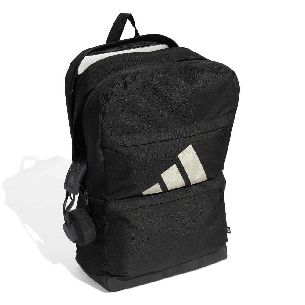- The adidas Unisex Motion Backpack is a versatile companion for any adventure. Made in part with recycled materials, it features a padded, adjustable design for comfort and a zipper for secure storage. Inside organisation keeps essentials tidy, making it a practical choice for both training and everyday use.