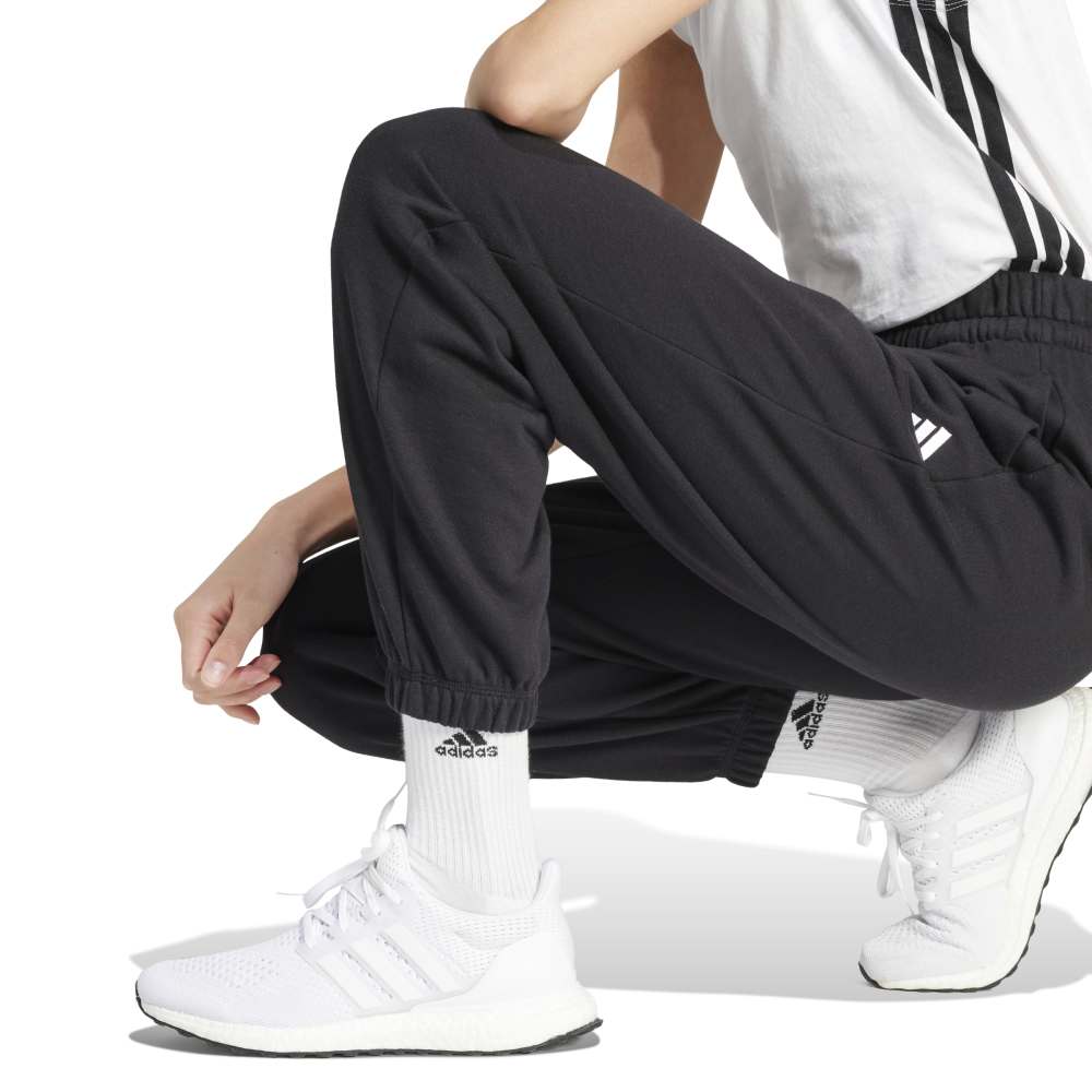 - Introducing the Essentials Small Logo French Terry Cuffed Pants, designed for the woman who values comfort and style. Made with a blend of 70% Better Cotton and 30% recycled Polyethylene Terephthalate, these loose-fit pants are a sustainable choice. They feature a modern open hem fit, cosy 240g fleece, and an embroidered logo on the left leg. Pair these with any favourite fashion item for an effortlessly chic look.