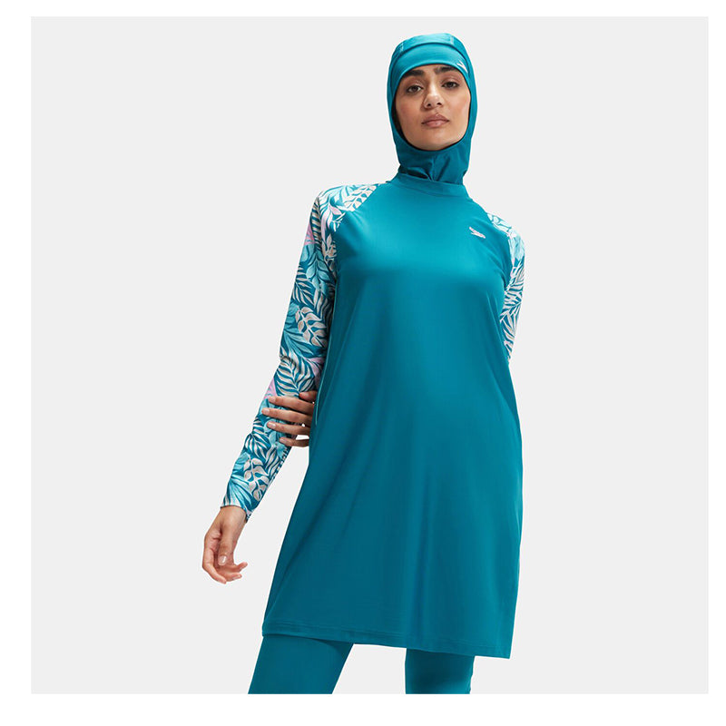- Dive into style and comfort with Speedo's Women's 3-Piece Swimsuit, featuring an eye-catching graphic print on sleeves. Includes a swimming hijab, top, and leggings for UPF40+ protection.