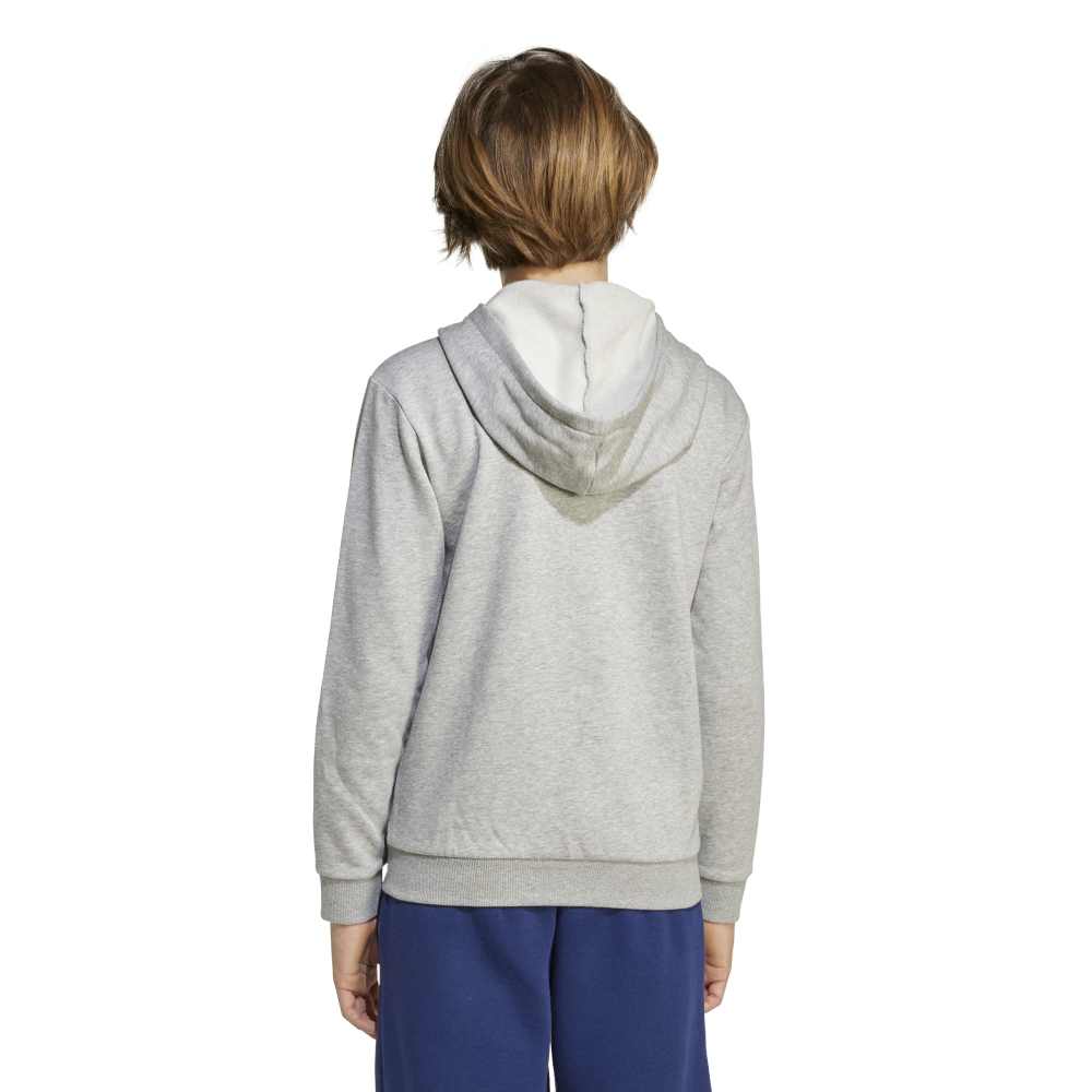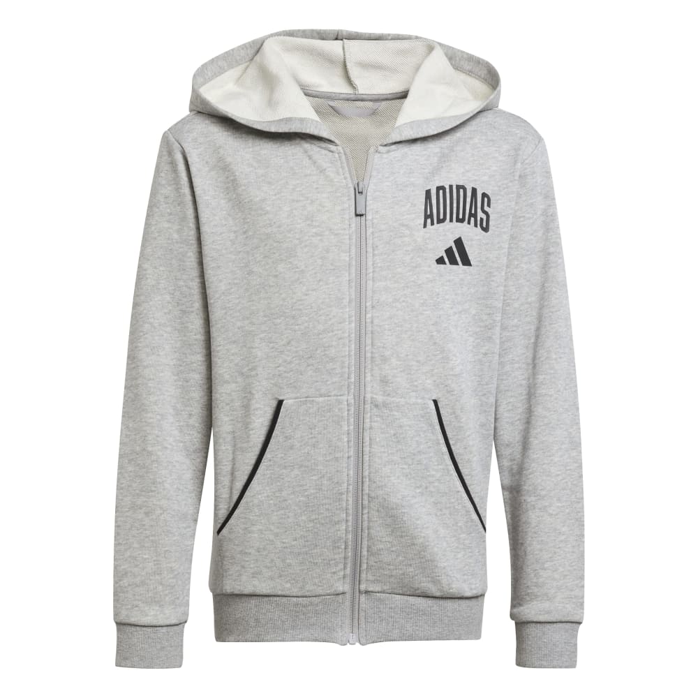 - Introducing the Seasonals Essentials Collegiate Typography Full Zip Hoody for juniors, a perfect blend of modern design and classic collegiate spirit. Made from 70% cotton and 30% recycled polyester, this regular fit hooded track top features a contemporary logo typography celebrating adidas' legacy in sports. The French Terry fabric, kangaroo pockets with contrast piping, and rubber print adidas branding on the left chest make it a stylish and comfortable choice for young sportswear enthusiasts.