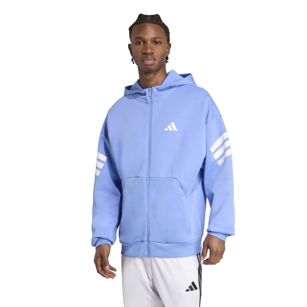 - Introducing the Future Icons Three Stripes Full-Zip Hoodie, a modern expression of adidas' timeless design. This regular fit, hooded track top, made in part with recycled materials, is a testament to our commitment to sustainability. Crafted from a blend of 67% recycled Polyethylene Terephthalate and 33% Better Cotton, it features bold, short, angled 3 stripes. This premium fabric hoodie is an embodiment of modern branding, designed to let you express yourself in comfort and style.